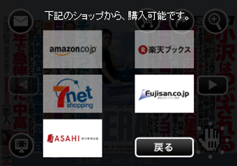 初回起動時に無料会員登録(メールアドレスを含む)をする必要があります。今日のナカツリ VIEWERを起動すると、デスクトップ画面下部中央に中吊り画像のプレビューが表示されます。ボタン操作で次の画像へ進んだり、戻ったり、自動的に切り替わるよう再生させることもできます。プレビューで気になるものを見つけたら、拡大ボタンで全画面表示させましょう。拡大状態で画像をクリックすると、その雑誌のWebサイトにジャンプします。また、ショッピングカートの機能も搭載されており、Amazonや楽天ブックスなどのオンライン書店を選択してんで購入することも可能です。